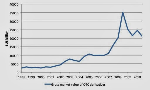 “Modeling derivatives is of particular importance due to the relative size of the derivative market when compared to the real economy. If we examine the Bank of International Settlements (BIS) estimate of “Amounts outstanding of over-the-counter (OTC) derivatives” in December 2010, this amounted to US$601,046 billion. To the World Bank estimate of World Gross Domestic Product (GDP) for 2010, the volume of financial transactions in the global economy is 73.5 times higher than nominal world GDP.