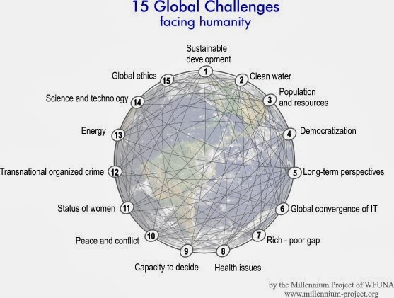 According to the Millennium Project, the biggest global challenges facing humanity are those illustrated in the image above. The image conveys a holistic message which some of us already appreciate: everything is connected with everything else. The economy isn’t indicated explicitly in the above image but, evidently, it’s there, just as the industry, commerce, finance, religions, etc. Indeed a very complex scenario. The point is not to list everything but to merely point out that we live in a highly interconnected and dynamic world. We of course agree with the above picture.