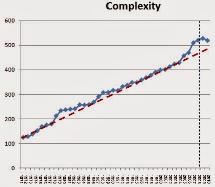 As the economy becomes more turbulent and complex, such a high number of risk classes will be less justified. In fact, as things get more complex, they automatically become less precise – this is known as the Principle of Incompatibility (high complexity is incompatible with high precision). Using data from the World Bank we have computed the evolution of complexity of the World as a system. The result is illustrated in Figure 1.