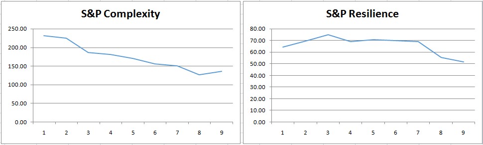 In all cases complexity is dropping steadily. In four months the S&P has lost 41% of its initial complexity, the NASDAQ 30% while the Dow 26%. In terms of resilience, the losses have been, respectively, 20%, 25% and 16%. What does this point to? Are we looking at a bubble about to burst? Dropping complexity is already pointing to a system that is “shrinking”, not in size or volume, but in terms of “vitality”. The dropping resilience indicates that as the markets are destroying complexity, the situation is becoming more fragile. Could this be the result of Quantitative Easing? Maybe. Paper burns very quickly. More soon.