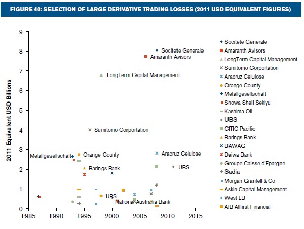 Derivatives are said to be very complex. Just how complex is that? Until one actually measures how complex a given derivative is, it is difficult to make any credible claims as to its amount of complexity. Sounds kind of obvious. But let’s suppose that this is indeed true. In effect, derivatives of derivatives (of derivatives…) seem to have been constructed in a fiendish way so as to confuse the non-expert investor. Very high complexity allows one to hide fraud, to cover up problems, incompetency, lax management, misunderstanding of the dynamics of the business etc., etc. This last aspect seems to have confused the experts too. Complex operations with complex products are likely to lead to unexpected outcomes and consequences. The figure below illustrates a selection of the largest recent derivative trading losses (Source: Operational Risk Modelling Framework, Milliman, February 2013).