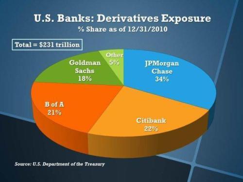 Of the $700 trillion of derivatives that are in the cyberspace $220 trillion is held by JPMorgan Chase, Citibank, Bank of America and Goldman Sachs, see below (source: US Department of Treasury):
