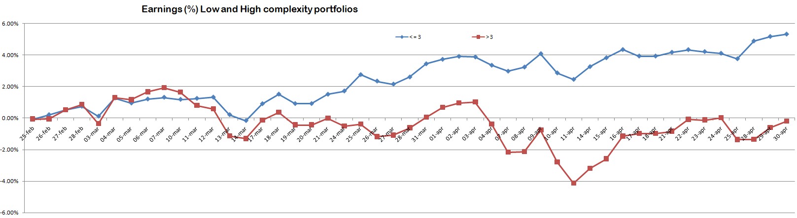 In both cases, low-complexity portfolios have performed significantly better than their high-complexity counterparts, offering a 3% and 5% performance over the 1.85% of the market.