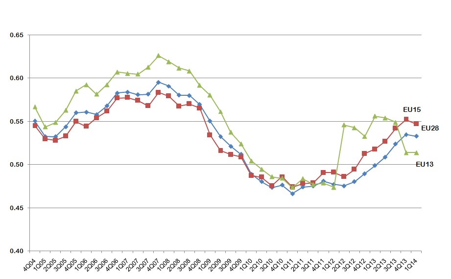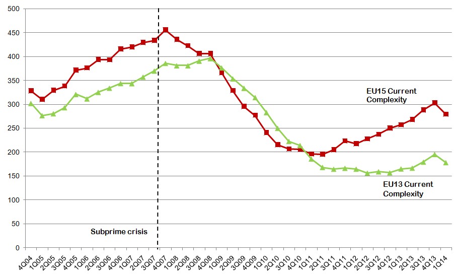Recent news (August, 2014) speaks of slowing economy in Germany and of France, where economy has come to a virtual standstill. Our complexity and resilience analysis of the Eurozone and its member states shows, moreover, that the Eurozone, seen as a system, is not out of the crisis yet. In actual fact, complexity, which measures the “vitality” of a system, is showing a tendency to shrink. While this remains to be confirmed over the next two-three quarters, this is not a good omen. The figure below illustrates the evolution of complexity of the 15 core EU economies, as well of the 13 members from Central and Eastern Europe.