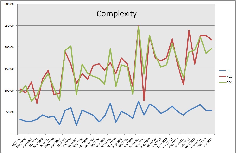It is evident how the Dow is the least complex (volatile). In fact, while its complexity has grown by approximately 55% over the past 14 years, that of the S&P and NASDAQ has increased by more than 100% and 120% respectively. This makes of course sense as the DOW doesn’t contain volatile high-tech stocks. In any event, what the above plot shows is that the S&P and NASDAQ are approximately four times more dangerous for the non-expert (and probably for the expert too) than the Dow (the complexity ratio is approximately 200/50 = 4).