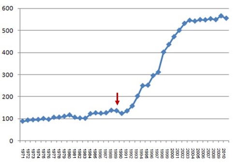 But another, even more dramatic turn of events took place approximately a decade before. The fall of the Berlin Wall in November 1989 has become the symbol of the fall of communism in Central Europe. A few months before, in June, the first ‘almost free’ elections in an eastern Block country were celebrated in Poland, paving the way to the first truly free elections in 1991. These events are reflected in Poland’s complexity in an astonishingly eloquent manner – the plot is illustrated below (red arrow indicates the fall of the Berlin Wall in 1989).