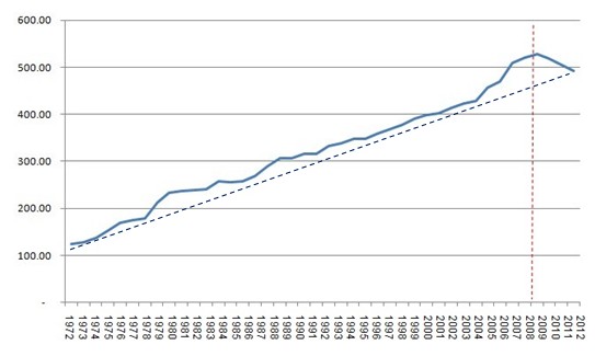 But why would all this lead to such a high rate of entropy production? There are very many possible causes and it is impossible to list them all and we will not attempt to do so. What appears to be evident is that our global society has a radically different set of values than it did in, say the 1970s. Our lifestyles are today generally more wasteful, largely driven by consumerism. Teenagers burn their existence in social networks (which do more to destroy society than to help it become better). There seem to be more tablets than books. Even the concept of family – the basic building block of any society – is being questioned. The new “liquid” culture embraces relativism and rejects stability in human relations. All this cannot but generate more waste.