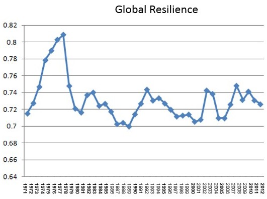 Based on data from the World Bank we have measured the resilience of the World (as described by over 1000 variables spanning the economy, education, healthcare, transportation, energy, etc.) over the past 5 decades. The result is illustrated below (Global Resilience Index™):