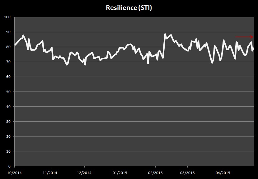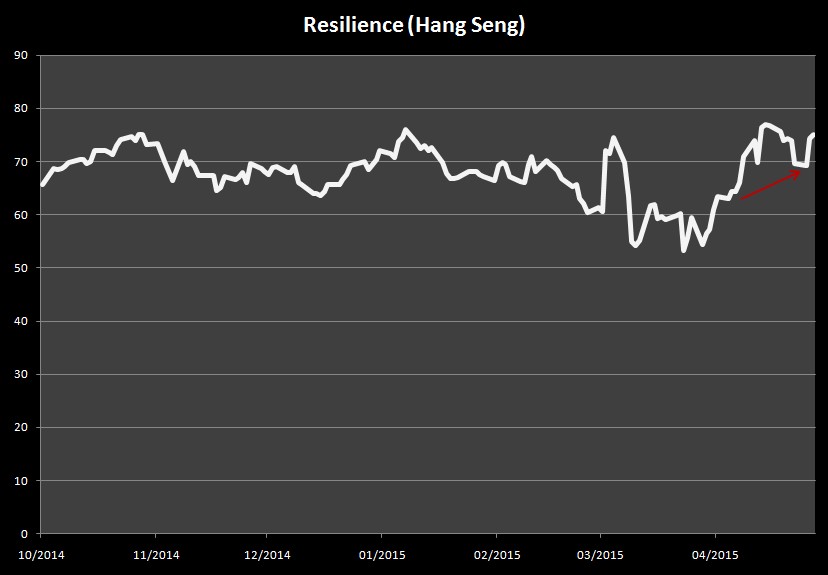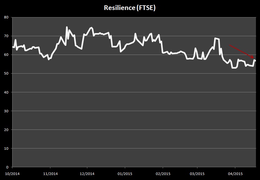 We have measured the resilience of major stock markets and market sectors over the past few months. The results are illustrated in the plots below, where a red arrow indicates the current tendency. First we examine some major stock market indices.
