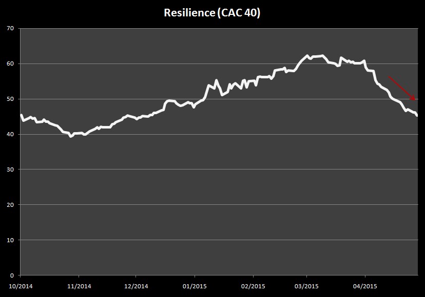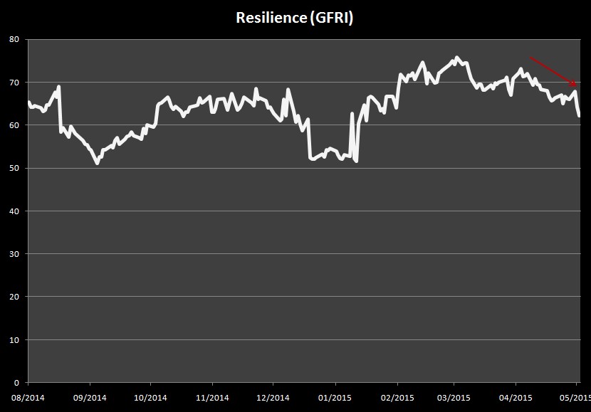 The Global Financial Resilience Index (GFRI™), which is based on 40 of the world’s major stock indices, shows a steady downward trend and at present registers a resilience of just over 60%.