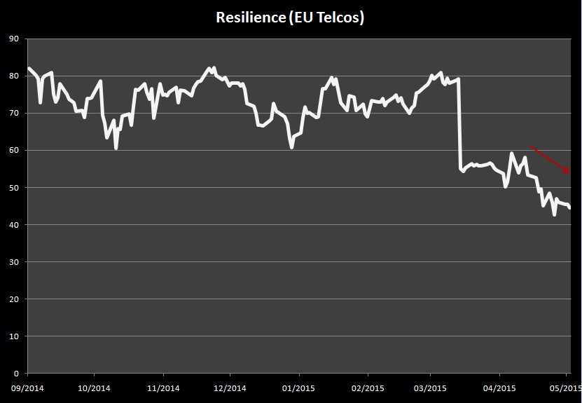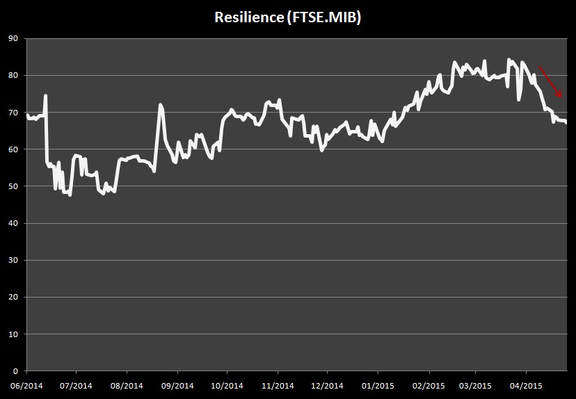 The analysis reveals that most of the major stock markets are on a downward trend in terms of resilience. This is certainly not good news. The fact that many of these markets already have low values of resilience (S&P, CAC 40, FTSE) is also not a good omen. The Asian markets (STI and HSI) are significantly more resilient and show a stable or upward trend. In terms of specific market sectors, Oil & Gas is very fragile (steady at 40%) as well as Automotive (55% and dropping) and Telcos (45% and dropping). The opposite situation is that of the system of large US and EU banks, with a resilience of 75% and growing. As for the Global Financial Resilience Index, which takes into account 40 of the World’s major stock markets, reflecting the stability entire global financial system, it is close to 60% but a diminishing trend is clearly visible. The alarming threshold of 50% could be reached in 3 to 4 months (around September 2015) if the current trend continues.