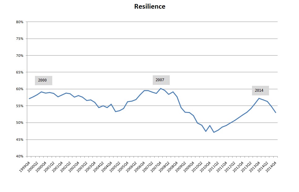 The evolution of resilience – the capacity to withstand shocks, contagion or destabilizing events – confirms the 7-year cycle but it also shows that the amplitude of oscillation is increasing (=volatility). Evidently, three peaks are insufficient to claim that this is indeed always the case. Cycle or not, resilience values of 50% point to a crippled system which is not well equipped to absorb shocks.