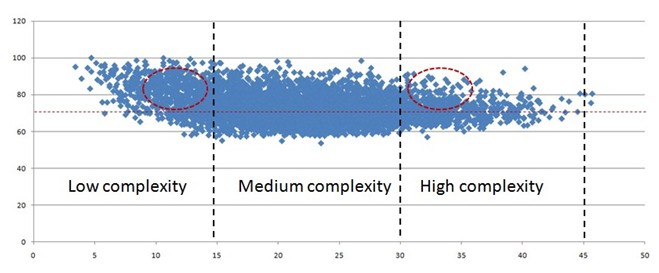 Suppose that one wishes to invest in US public companies and eventually two candidate portfolios are available. Suppose that both portfolios are built on companies having a resilience that is higher than that of the entire system of US public companies. The plot below indicates the resilience and complexity of this system which comprises over 5000 companies. The horizontal dashed line indicates the resilience of the system, approximately 71% (this is not a statistical average!). Suppose the two portfolios contain companies which belong to the two pools indicated in the plot below.