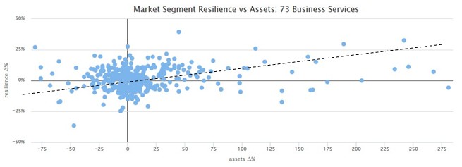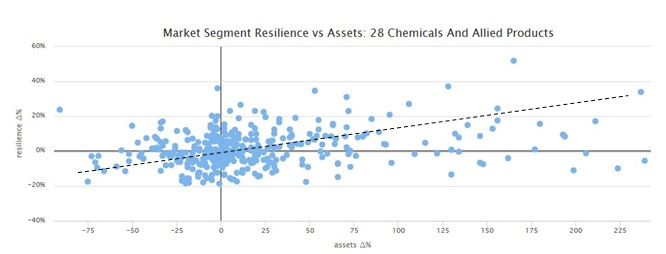 Analysis of a number of sectors shows how, in effect, companies which have enjoyed a consistent increase of year-on-year assets are also those which have increased the resilience of their respective businesses. The analysis shows that this is clearly not always the case however, more companies which have increased their assets have also recorded an increase in resilience than those which didn’t.