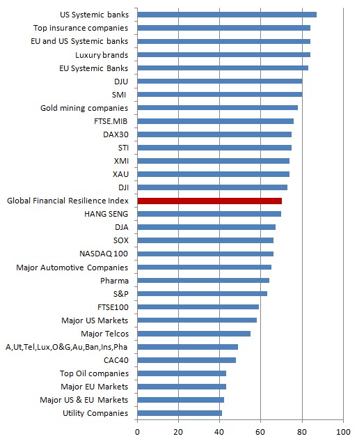 In this blog we illustrate how analyzing single markets or industry sectors can yield excessively optimistic results. The bar chart below lists the resilience of markets, systems of markets as well as sectors and systems thereof. Its importance to investors cannot be overstated.
