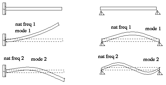 We know that modal analysis is equivalent to finding a set of ‘shape functions’, which combined appropriately can describe a complex shape. An example of two modes of a clamped-free and simply supported beam are illustrated below.