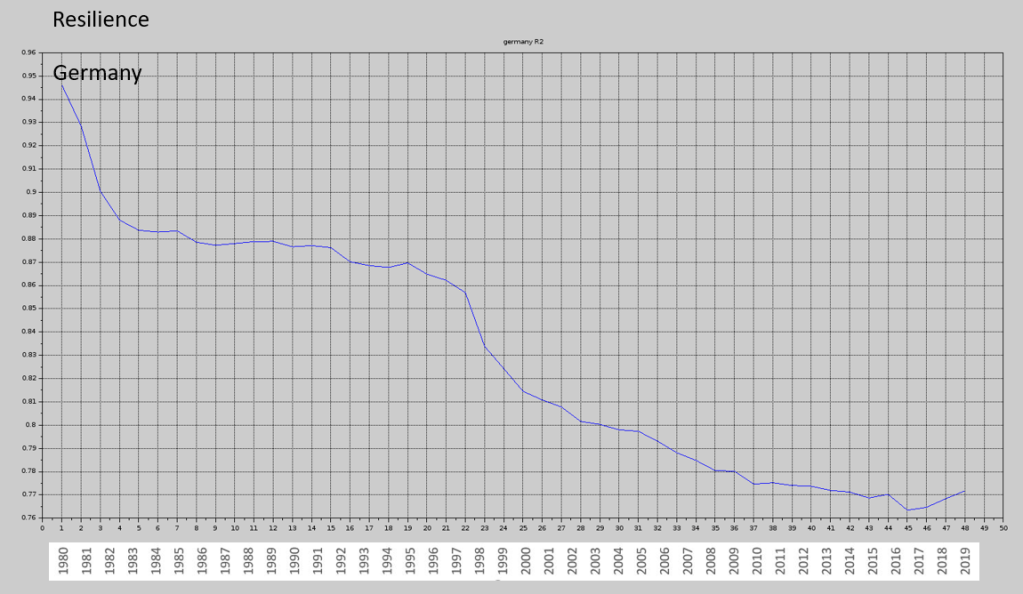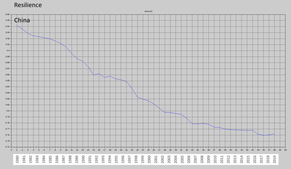 In the second half of the 1990s, most countries experience a sharp loss of resilience which has slowed down only around 2010. Again, in the case of China, we observe a mild, more controlled and steady evolution of resilience. In the case of Poland, the drop in resilience is dramatic. The leftist totalitarian governments kept the country in a state of highly stable (resilient) stagnation and crisis, guaranteeing control over the society thanks to induced poverty, propaganda, fear and mis-information.