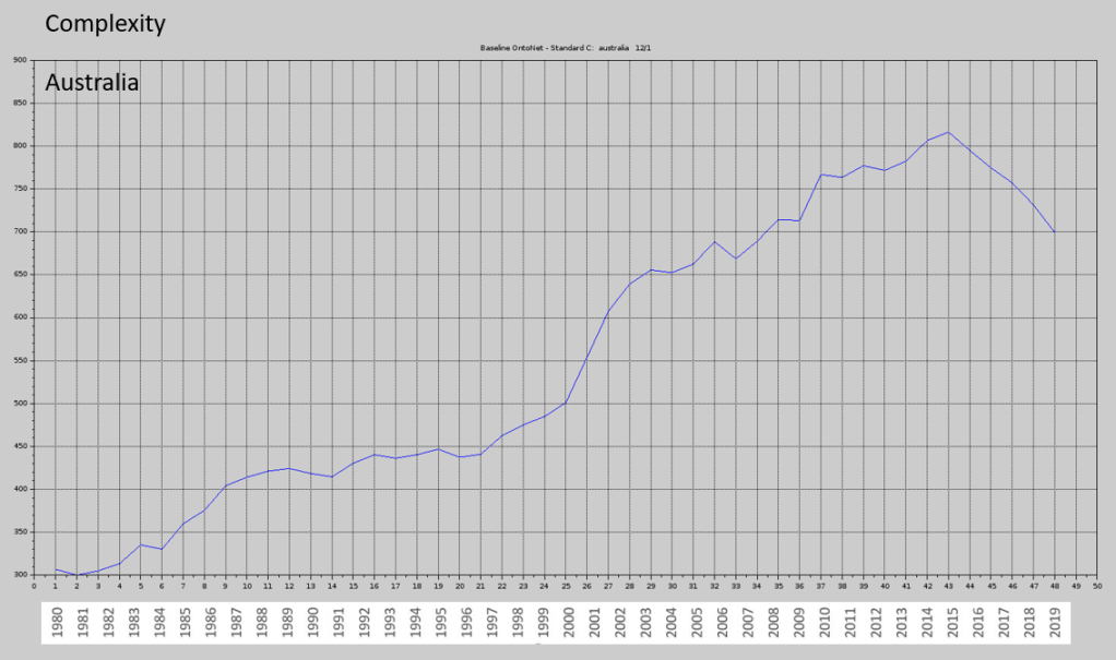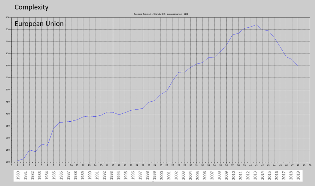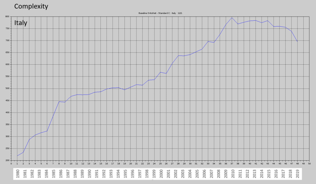 Something similar happens to societies, cultures, economies, countries. Things naturally become more structured, more complex not less complex. Drastic reduction of complexity takes place in concomitance with disasters or conflicts. High complexity is not a bad thing, until it gets to close to the so called “critical complexity”, which corresponds to a state of chaos, unpredictability, little or no controllability, extreme fragility. Resilience is the opposite of fragility. A period of flat complexity corresponds to stagnation, lack of vitality. A loss of complexity reflects crisis, regression and destruction (not just of the economy but also of soeciety). Not progress.