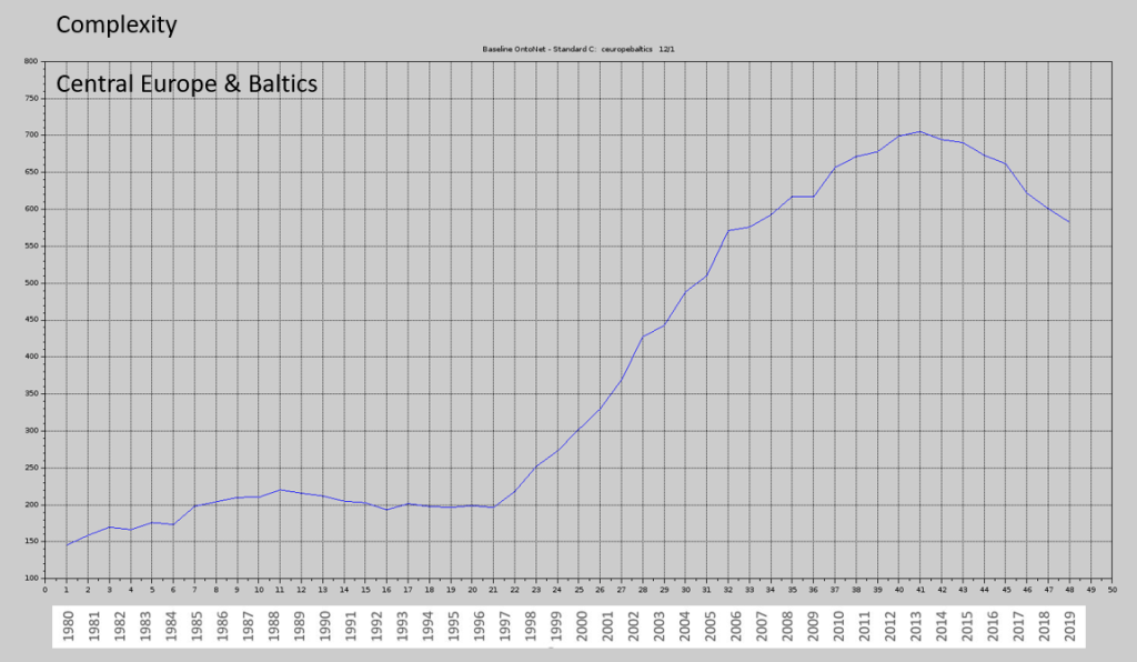 Central Europe and Baltics follow the pattern shown by Poland, the largest of the ex COMECON states. What is clearly visible is the dramatic loss of complexity of the European Union. Percentage-wise, this is the largest drop of complexity experienced by any macro region or even country. The complexity of the failed European project in 2019 is the same as in 2007 and, what is worse, the tendency is still in a stage of sharp reduction. If the tendency continues, in two years time the European Union will have regressed to levels of 2001-2002. This is equivalent to a loss of 20 years.