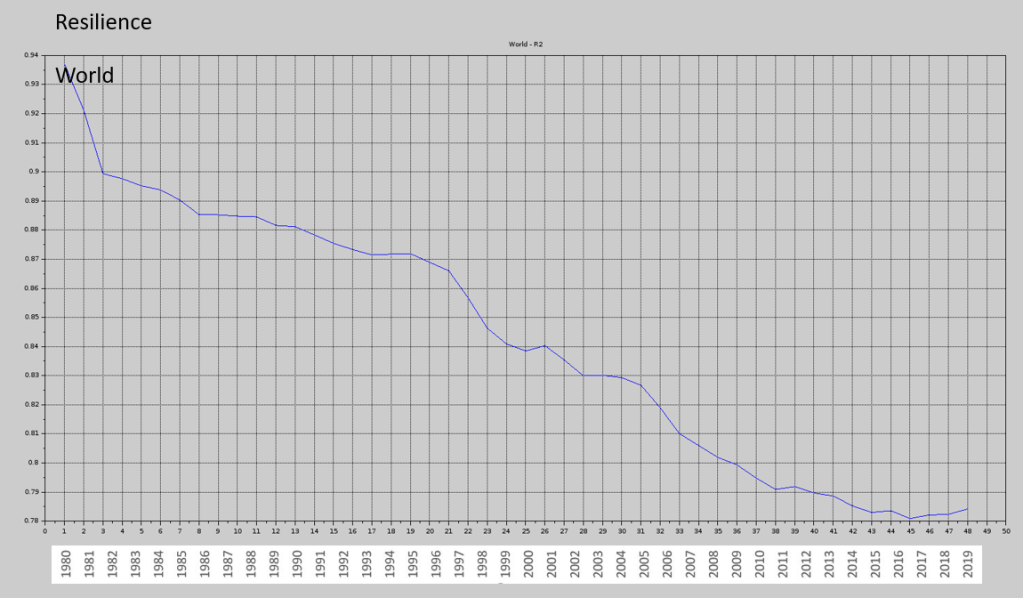 In terms of resilience, the World is slightly less resilient than the macro regions as well as most countries. The European Union is resilient – around 80% – and, like in the case of the other macro regions, the tendency is to increase. Is this good? Well, resilient systems by definition tend to oppose change. And nowhere more than in the EU it is vital to implement change and reforms. It is paramount to avoid converging into a situation of low complexity and high resilience which is equivalent to the COMECON, which was founded by J. Stalin in 1949. Look at Poland, Central Europe and the Baltics.