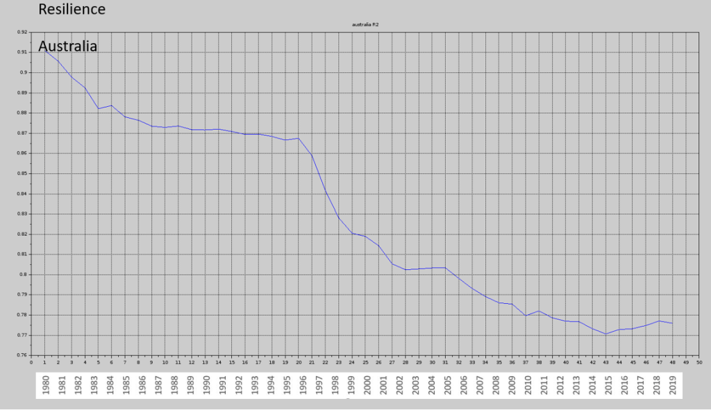 And now let’s look at resilience of the above countries. Since the world is tightly interconnected – think of the economy, finance, crime, information and information manipulation – the resilience of many countries has converged to very similar levels (75-80%) although following a different trajectory.