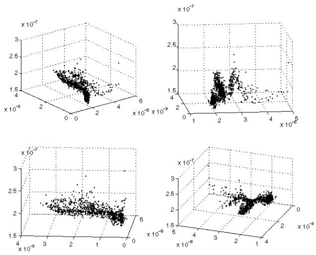 Figure 1. Example of Fitness Landscape. The four views refer to the same data-set and represent different combinations of axes. As one moves within the landscape, different local properties, such as density for example, will be observed in the vicinity of each point. The fitness in in every point of the landscape is equated to complexity.