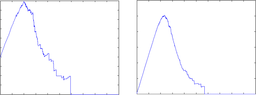 Figure 4. Examples of evolution of complexity versus time of two closed systems. The plot on the left represents a 20-dimensional system, while the one on the right a 50 dimensional one. In the case of the smaller system, the maximum value of complexity that may be reached is approximately 3, while in the case of the larger system the threshold is approximately 12. The corresponding graphs have density of 0.1 and 0.2, respectively.