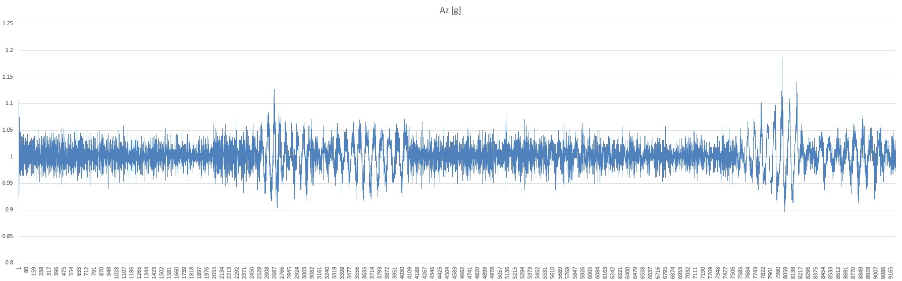 Measurements during various phases of the flight have been made. The microphone and eccelerometer output (vertical acceleration, Az[g]) are shown below. Both records correspond to the last moments of the flight, including the landing. In the microphone plot it is evident how the engine slows down once the plane has landed.