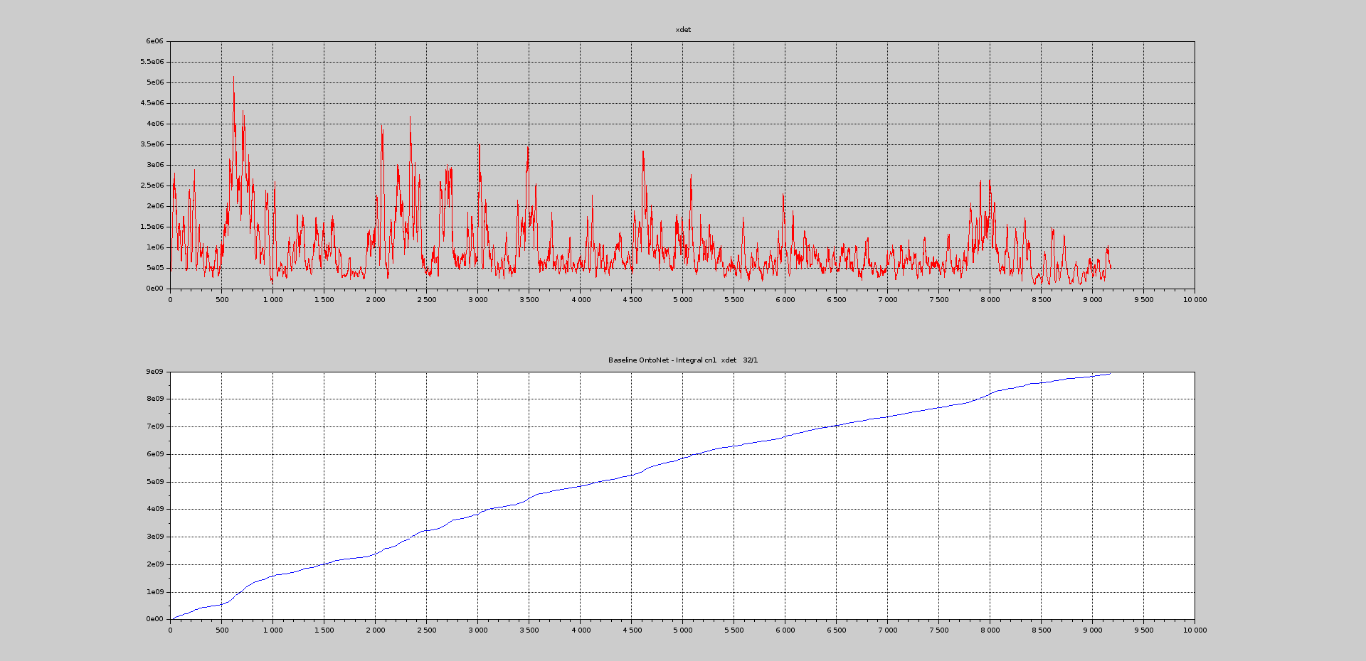 The above time histories have been processed using OntoNet, Ontonix’s QCM computational engine. Two complexity metrics have been computed; standard complexity (C), and a modified complexity metric (Cn1), as well as the corresponding integrals over time. Integration allows to measure the ‘total accumlated complexity’, which one could see as ‘total stress’.
