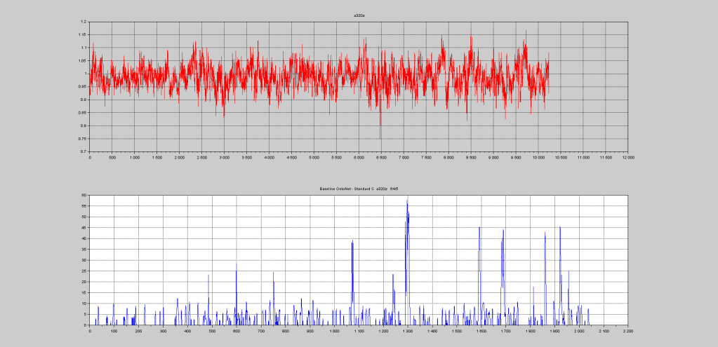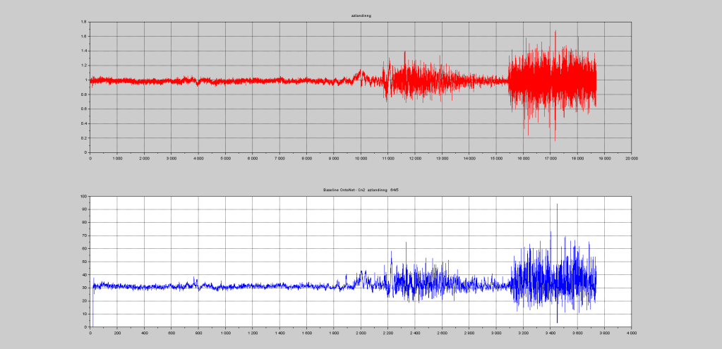 Vertical acceleration has been recorded throughout the first two minutes of the flight, including the take off run. Take off takes place at step 7000, exactly in the middle of the chart. Peak acceleration after take off reaches 0.3 g. Similar levels are recorded during the actual take off run. Complexity is highest during the take off run, indicating that this is not a phase of high cabin comfort. Once the aircraft is airborne, complexity goes down to zero almost immediately. The minor peak in complexity on the far right of the chart corresponds to the landing gear being retracted.