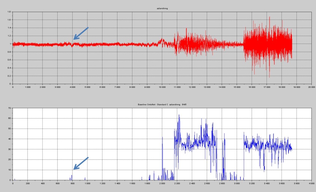 Landing. The last three minutes of flight have been recorded. The arrow indicates the moment when langing gear is dropped. Complexity reflects this with a minor peak. The actual landing gives rise a vertical acceleration of 0.1 g (the pilot was really good in this case!). However, when aerobrakes and thrust reversers are deployed, vibrations increase significantly. Again, complexity relfects this quite eloquently.