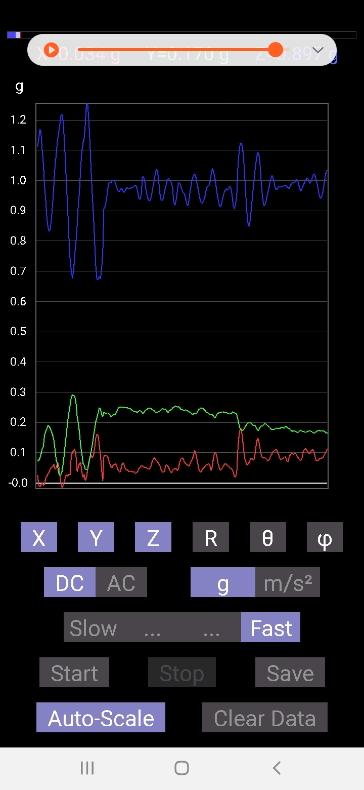 The following experiments have been performed during take off and landing. Since the iCOMOX used in the experiment must be connected to a computer in order to record the data, and because computers must be switched off during take off and landing, accelerations have been measured using a smartphone App. The App, always in flight mode, looks as follows: