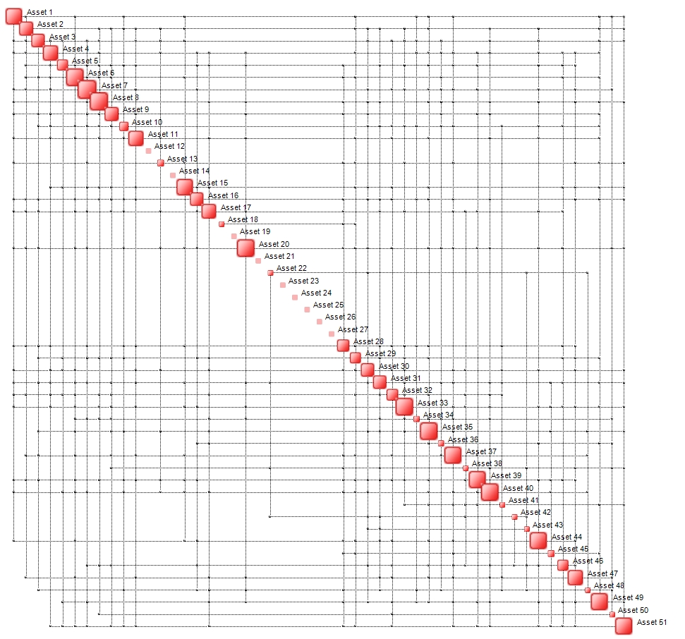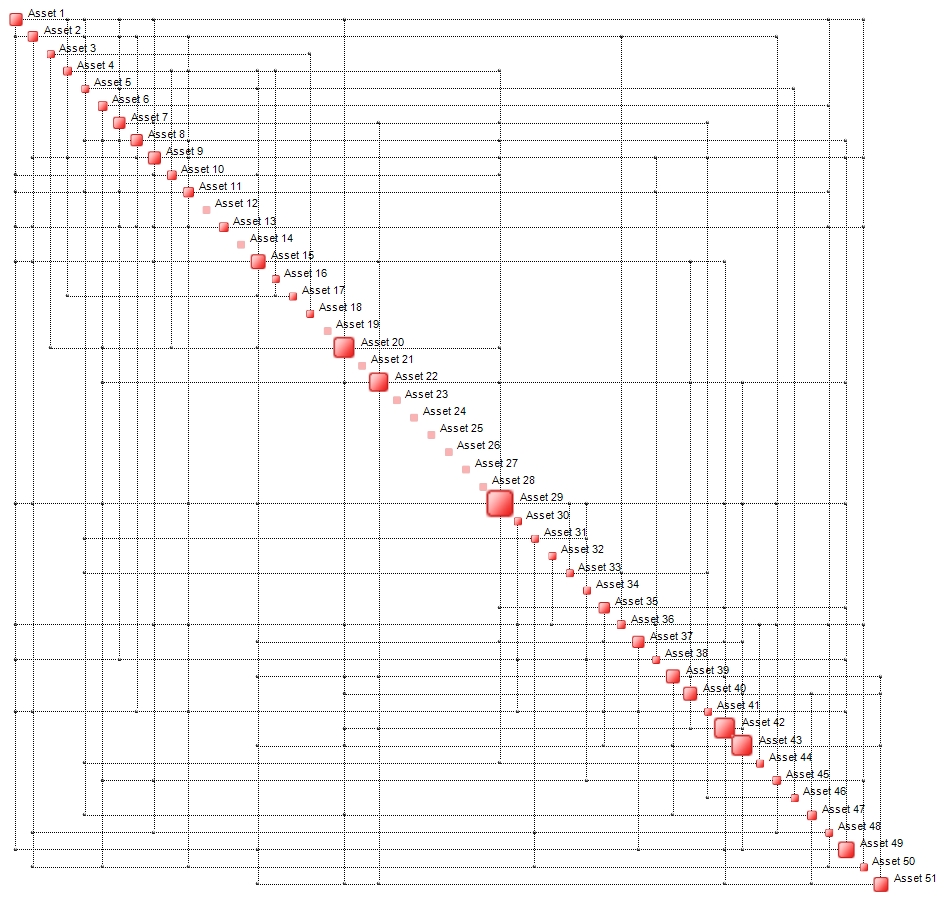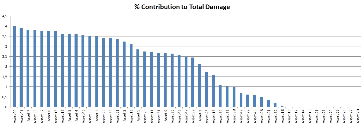 Crippling or destroying Asset 44 induces 4% of the total damage. A additional 3.8% is contributed by Asset49, etc. Other Assets, such as 10, 12, 14 or 19 do not contibute to any systemic damage of the network. This means that targeting them may not have been a good idea.