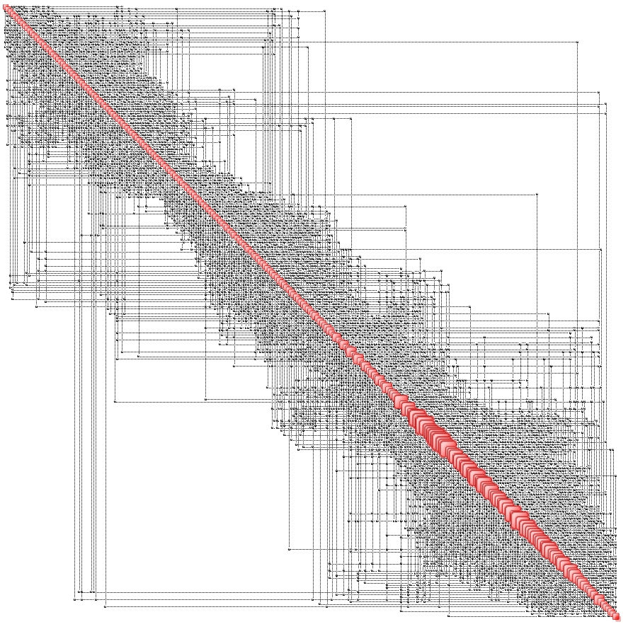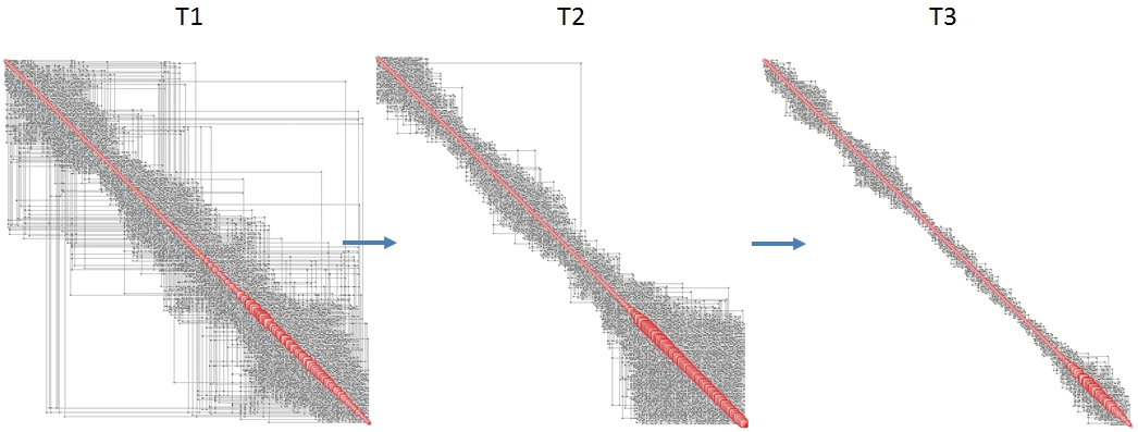 The Complexity Map at T1 – corresponding to peak complexity – is illustrated below. The map has 258 nodes, 8262 rules and a density of 25%.