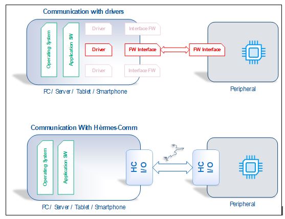 The Hèrmes-Comm® technology allows you to connect any hardware (peripheral, circuit, board, …) to the computer software (Server, PC, Smartphone, Tablet, circuit) without the need to install drivers, making it simpler, faster and above all secure. It eliminates the need to install the device driver and does not require special protocols, as it takes advantage of features available in each Operating System.
