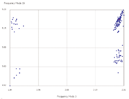 Example of a complex meta-model, where four distinct clusters are visible. Each point cor- responds to an execution of a normal modes analysis (SOL 103). The axes report the nat- ural frequencies of two particular modes of vibration.