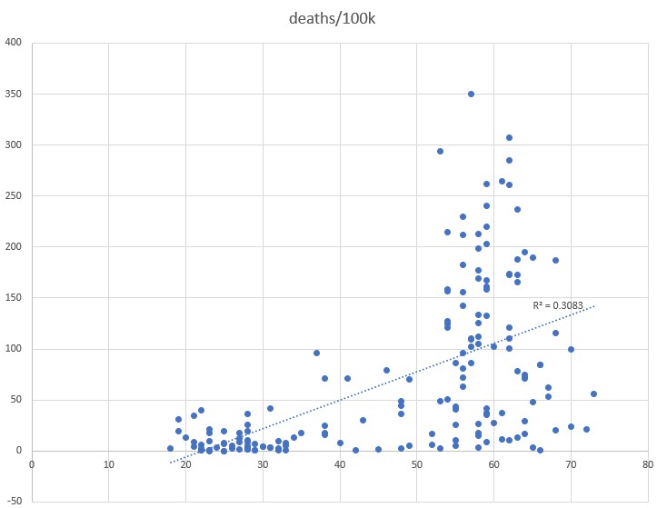 In essence, to claim that there exists a correlation between the percentage of population with BMI>25% and number of Covid-19 deaths per 100.000 population is an extremely debatable statement. All that one can state in this case is that for values below 50%, the mean deaths per 100.000 are approximately 30, while for values greater than 50% it is around 130, see chart below.