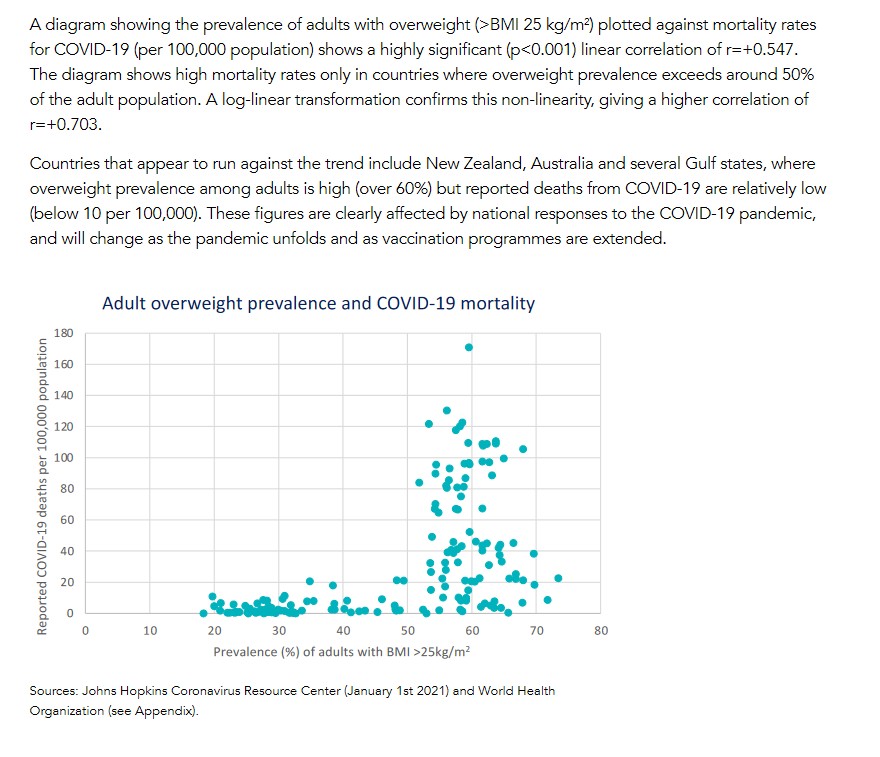 A recent study by John Hopkins University speaks of correlation between the number of covid-19 deaths and percentage of population with a BMI greater than 25 (i.e. that is obese). The image below has been extracted from the said report (see bottom of image for source)