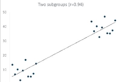 A linear correlation of 0.55 has been found. However, the said data clearly lacks any linear character and therefore linear correlation is not applicable to this sort of data. The example below shows how silly conclusions may be drawn based on linear correlations when these are not applicable. The 94% correlation in this case is absurd to say the least.