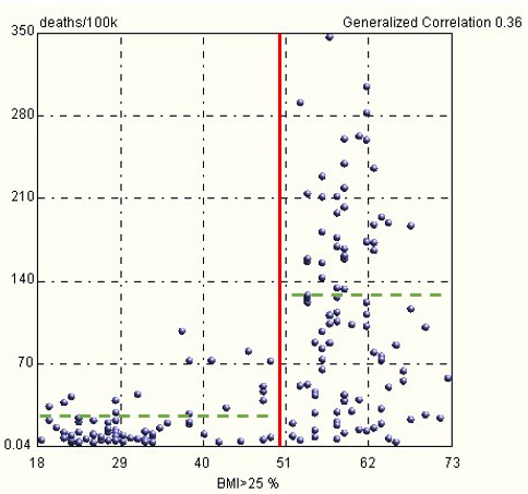 In essence, to claim that there exists a correlation between the percentage of population with BMI>25% and number of Covid-19 deaths per 100.000 population is an extremely debatable statement. All that one can state in this case is that for values below 50%, the mean deaths per 100.000 are approximately 30, while for values greater than 50% it is around 130, see chart below.