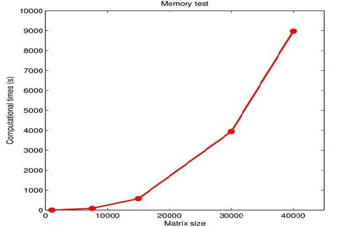 Since the computational bottleneck of the problem of interest is the available memory, we first run a test case to find the greatest allowed dimension of the local matrices. In details, the driver has been run with a 4×4 grid of MPI processes restricting the computation on a single FERMI node. Computational timing results are shown in Fig 1 as a function of the matrix size. The greatest matrix size allowed resulted to be 40’000, which means that the greatest allowed size for the local matrices is 10’000 (i.e. 750 MB in double precision).