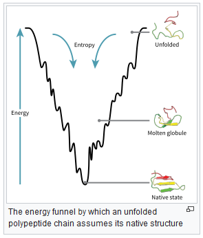While a protein tends toward a minimum-energy configuration, at the same time it maximizes its own complexity. This makes sense if we recall the definition of complexity: complexity is structured information. The shape of a protein encodes information (the DNA, for example, is a structure that encodes information through the order, or sequence, of the nucleotides along each strand). For a given ensembles of aminoacids, which will ultimately fold into a protein, nature does two things: it minimizes the protein’s energy and, at the same time, it maximizes the amount of information that it can encode with those aminoacids. With all likelihood – this is only a conjecture – the final state of a protein is a compromise (combination) of these two key attributes: energy and information.