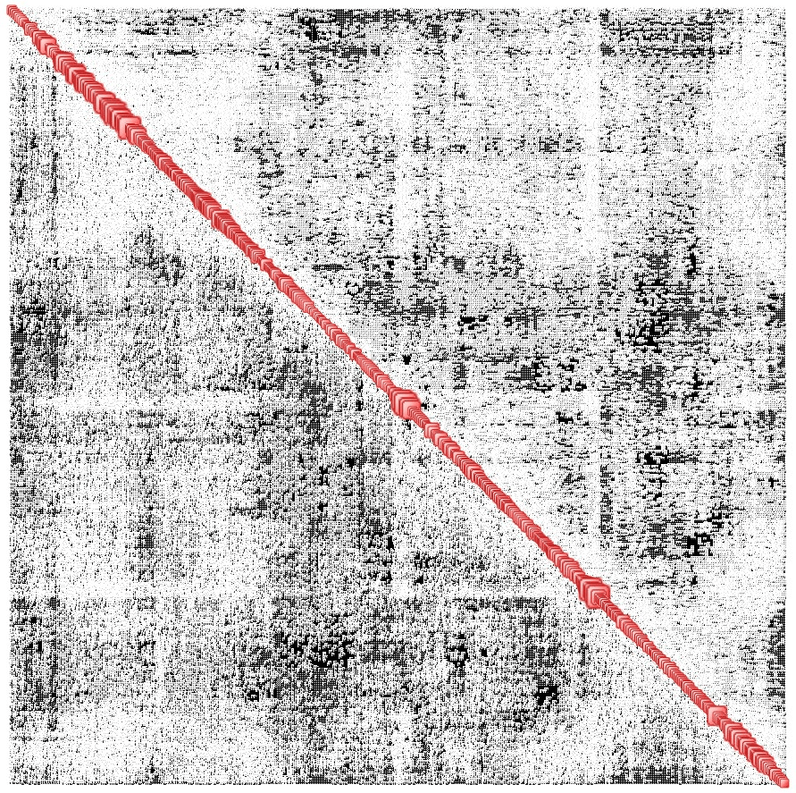 The Complexity Map of the 435-atom protein in the vicinity of its final state is shown below. The number of nodes on the diagonal is of course 435 x 3 = 1305, and the number of interdependencies is just under 210 000 while the map density is 25%.