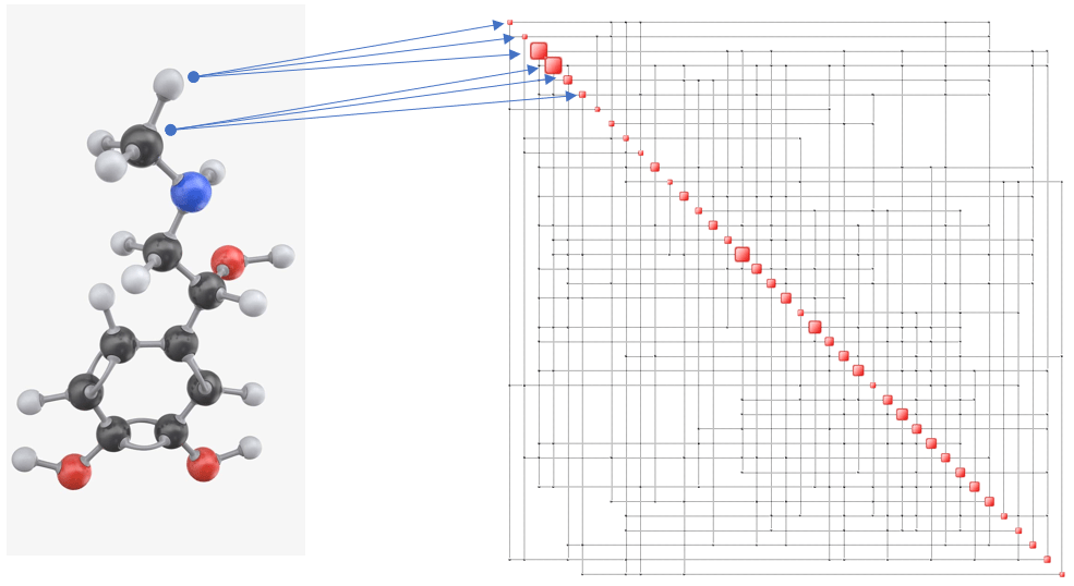 An example of what this map represents is shown below. The first three nodes in the Complexity Map are, respectively, the x, y and z coordinates of the first atom, the following three are those of the second atom, and so on.