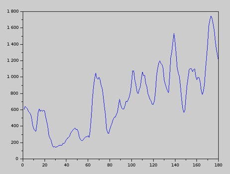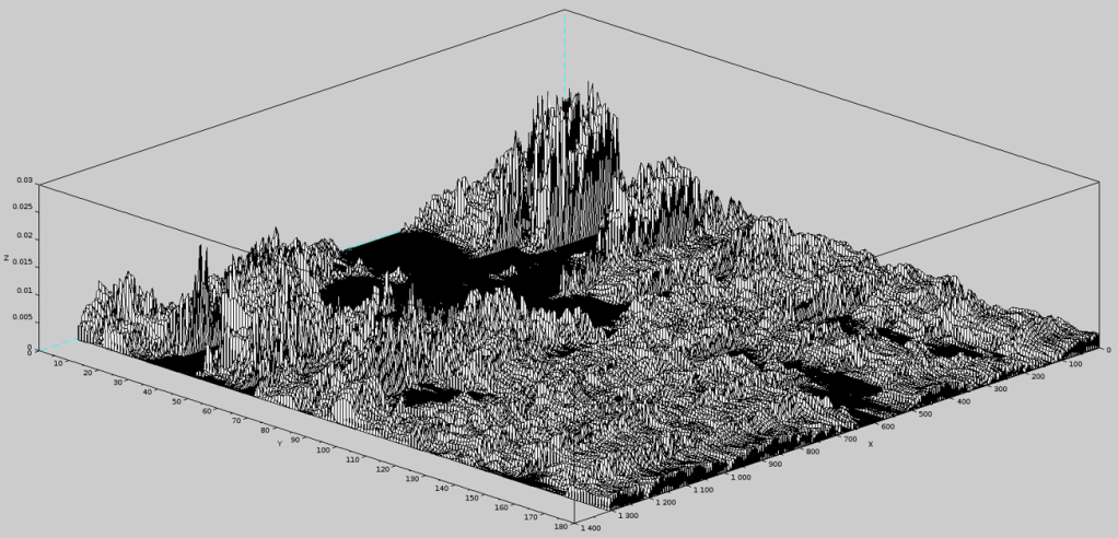 Only as a matter of curiosity, we illustrate below the Complexity Landscape of the 435-atom protein in question. The landscape has dimensions 180 (these are discrete frames used to display complexity and its landscape) by 1305.