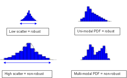 First of all, let’s focus on the simple “scalar” definition of robustness. The commonly accepted definitions of robustness mistakenly state that a system with low scatter in performance is robust. We state that a single-degree of freedom system behaves in a robust manner if its probability density function (PDF) is uni-modal. When the PDF is multi-modal – see figure below – the system (in the case of a particular variable or channel) can spontaneously jump from one peak (mode) to another.