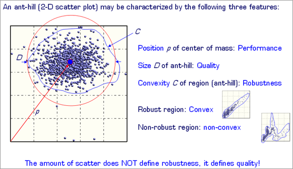 It becomes clear, at this point, that the amount of scatter does not point to robustness. It merely indicates quality. In other words, a high-quality product will exhibit small scatter in its operation. This means that any two products taken off the assembly line will be very similar in performance. Low quality, on the other hand, will be reflected in a non-repeatable delivery of performance or characteristics. The concept is summarized in two dimensions in the figure below (Fig. 3).