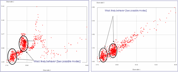 Uni-modal distributions indicate systems which, for a particular channel, have only one most-likely response, or behaviour. In bi-modal or multi-modal distributions, a system can spontaneously deliver two distinct most-likely modes of behaviour. Therefore, one may see the departure from an equivalent Gaussian (uni-modal) distribution as a measure of simple, or scalar, robustness. The presence of multiple peaks in a PDF indicates clustering which, in turn, points to bifurcations. The fact that there exist clusters points to discontinuities or other pathologies in the input-output mapping. An example, shown in the figure below (Fig. 2), indicates how a rectangular region of the input space, when sampled uniformly is mapped onto a discontinuous domain in the output space. The white circle indicates an area of the output space where a bifurcation is present. This means that small changes in the values of the inputs may place the response on one of the two branches within the white circle. This may mean that the system changes behaviour or mode of operation. Evidently, such situations must be avoided.