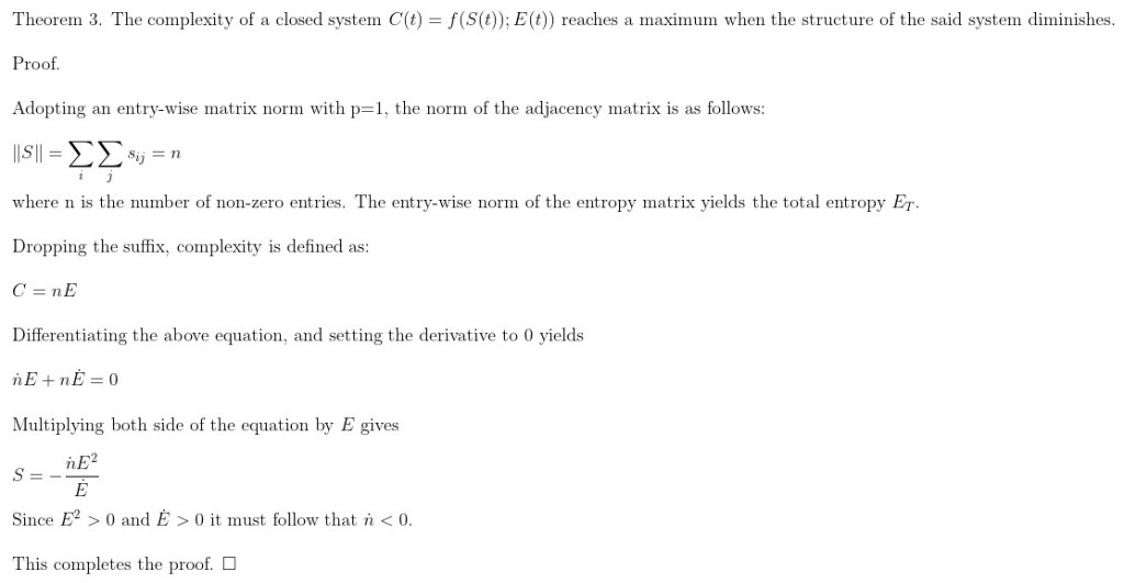 What this shows is that at peak complexity, the number of entries of the adjacency matrix in C=f(S; E), i.e. n, starts to decrease. NB, we’re not saying that the maximum value of complexity corresponds to a global maximum. Basically, before a peak in complexity is reached, the system is building up structure. The moment complexity peaks, structure starts to dissolve.