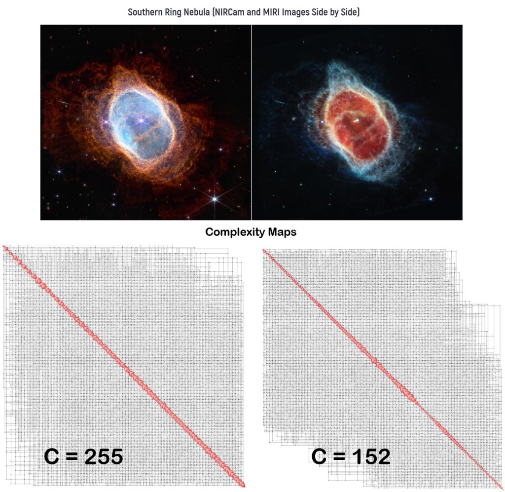 The idea is to measure the “distance” between these two images. How is this done? Quite simple. Complexity measures the total amount of structured information. This is expressed in bits. Based on the complexities of the two images (C=255 kb for the NIR image, and C=152 kb for the MIRI image) we can measure the difference in structured information to be around 67%. The picture belows shows both images as well as the corresponding Image Complexity Maps.